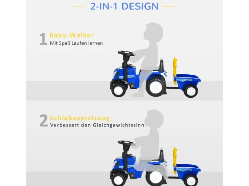 Entdecken Sie diesen schnittigen Kindertraktor von HOMCOM – ein zauberhaftes Tretauto für abenteuerlustige Knirpse, mit dem sie nicht nur fahren, sondern auch spielend das Laufen erlernen werden! Zudem bieten der breite, abnehmbare Sitz, die Hupe und die strahlenden Scheinwerfer eine sagenhafte Spielerfahrung im Sandkasten. Im koppelbaren Anhänger findet sich reichlich Platz für eine Snackbox, Sandspielzeug oder eine Trinkflasche. Schenken Sie Ihren kleinen Abenteuern unvergessliche Momente!