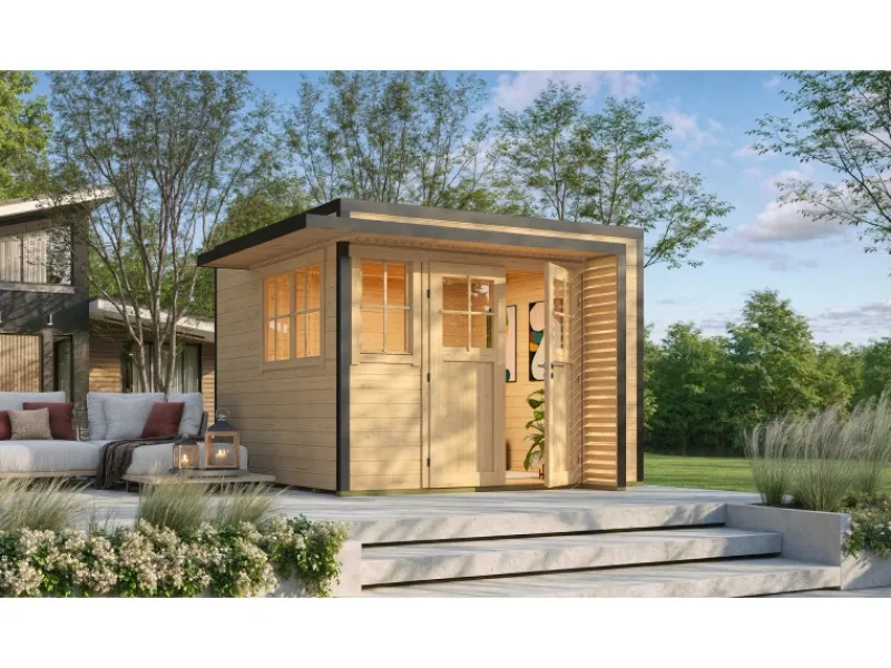 Die Variante 300 cm × 300 cm mit einer Wandstärke von 28 mm ermöglicht durch die Doppeltür ein einfaches und schnelles Verstauen der Geräte. Durch die zahlreichen Fenster und die Doppeltür mit integriertem Fensterelement fällt viel Tageslicht ins Innere – ideal für ein angenehmes Arbeiten.
