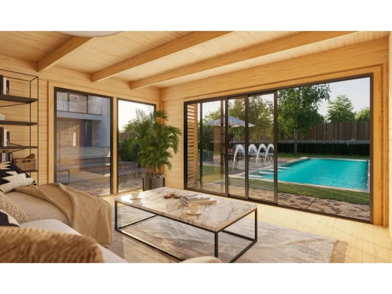 Wenn im Haus kein Platz für ein Home Office ist, stellt diese Variante eine sehr gute Alternative dar. Mit einer Größe von 400 cm × 400 cm und einer Wandstärke von 44 mm bietet dieses Gartenhaus viel Platz. Die dreiflügelige, bodentiefe Schiebetür sowie zwei feststehende Seitenfenster lassen viel Tageslicht ins Innere.