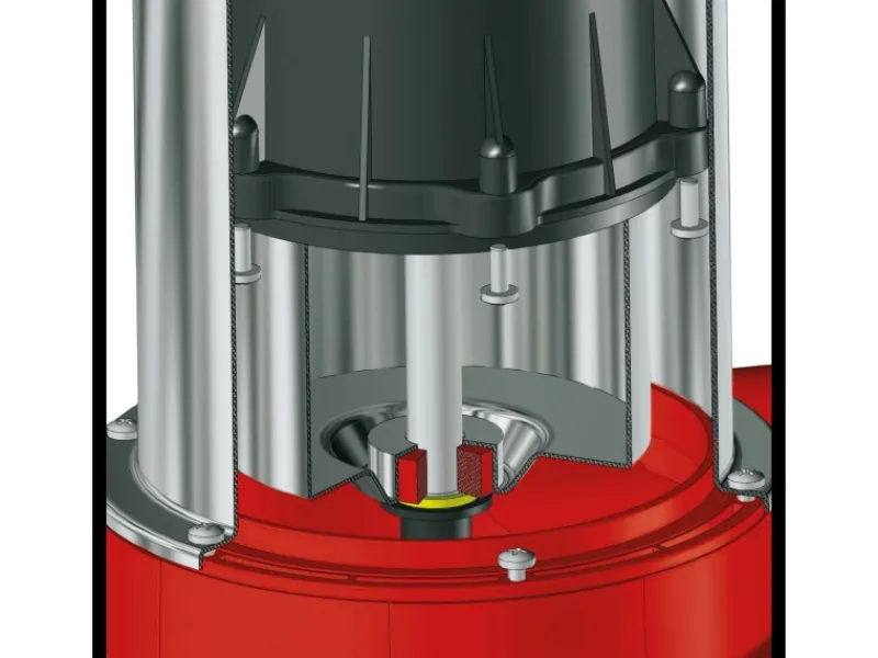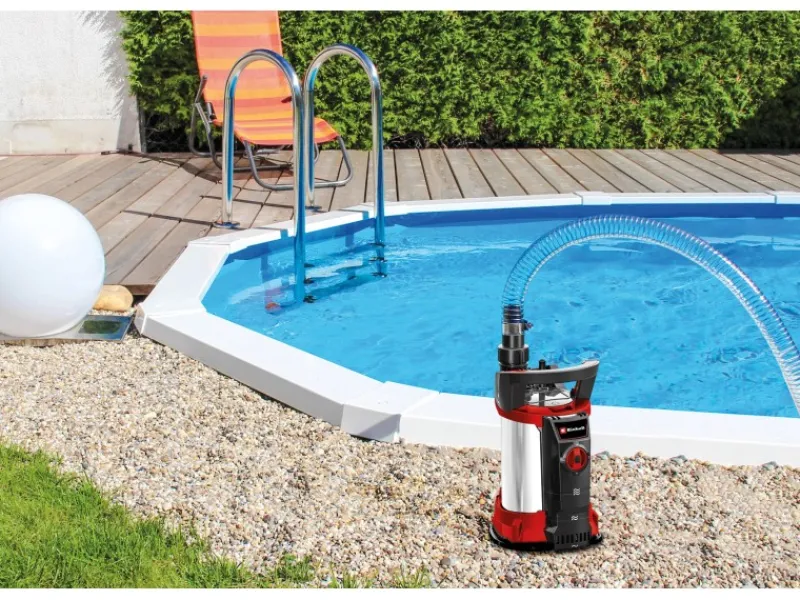 Das Pumpengehäuse besteht aus schlagzähem Kunststoff mit einer Edelstahl-Außenhaut und ist mit einer hochwertigen Gleitringdichtung versehen, was Robustheit und eine lange Lebensdauer gewährleistet. Ein ergonomischer Tragegriff, eine integrierte Aufhängeöse sowie ein Universalanschluss für 25 mm und 32 mm Schläuche erleichtern den Transport und die Handhabung der Pumpe. Der Schlauchanschluss befindet sich gut erreichbar an der Oberseite der Pumpe.
