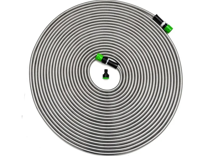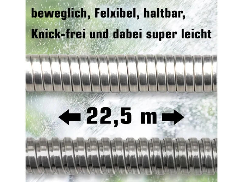 22.5 m langer Rasenschlauch. Außen Metall, Innen PVC. Set mit Kupplung & Anschluss-Adapter