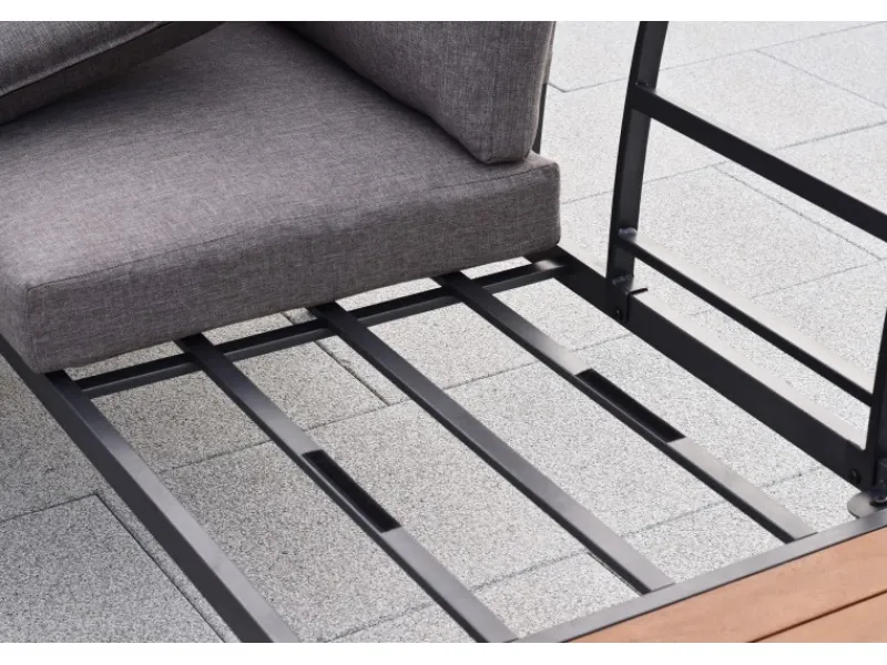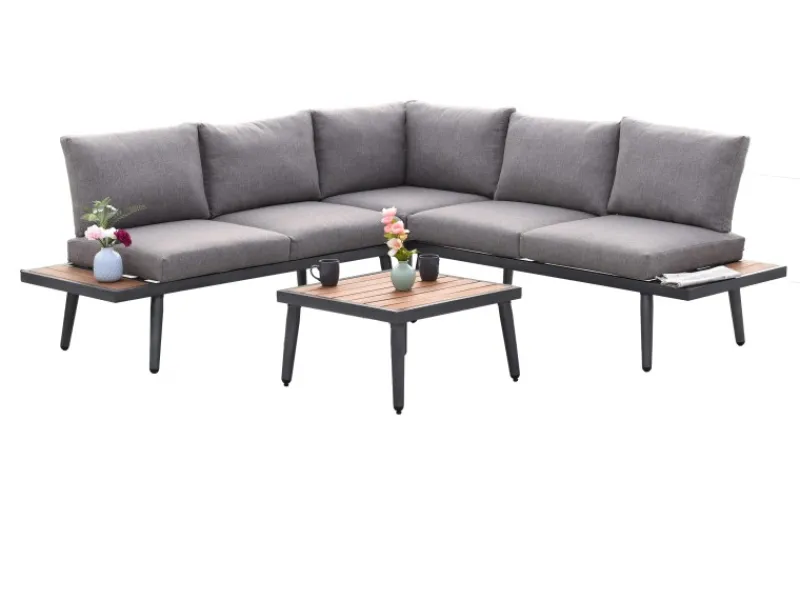 Das Garteneck-Set Korfu zeichnet sich durch eine Tischplatte sowie seitliche Ablageflächen aus innovativem Kunststoff in realistischer Holzoptik aus. Dadurch bringt es eine harmonische Natürlichkeit in Ihr Outdoor-Design.