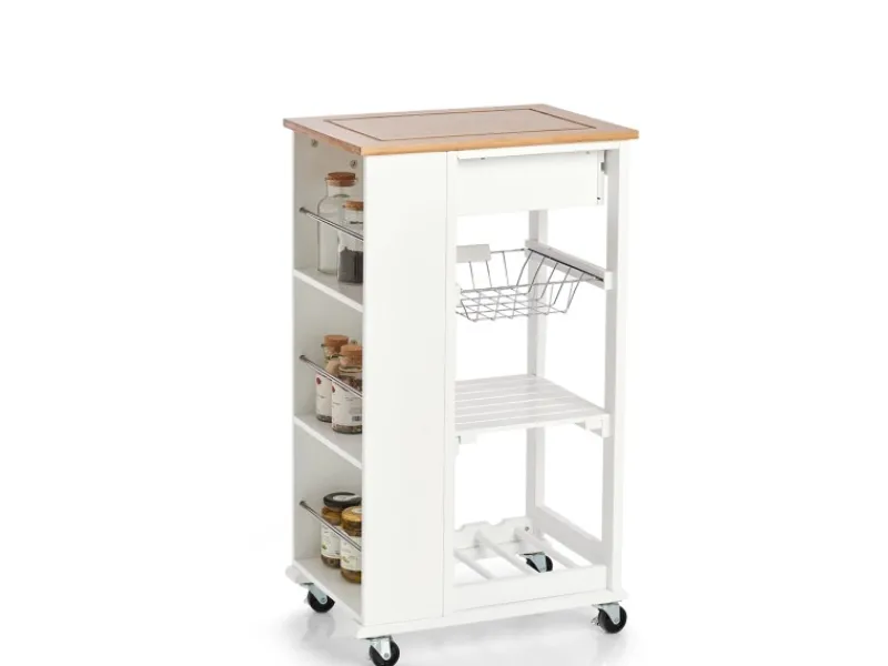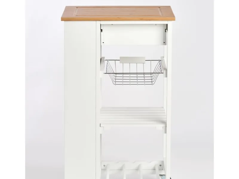 Die Flaschenablage bietet Platz für drei Flaschen Ihrer Wahl, in der oberen Schublade werden Küchenhelfer wie Schere und Co. sicher verstaut und der herausziehbare Korbeinsatz dient als perfekter Stauraum für Küchentücher. Dank seiner vier Rollen kann der Rollwagen problemlos bewegt und verschoben werden. Ein sicherer Stand ist mittels zweier Feststellbremsen dennoch gewährleistet.