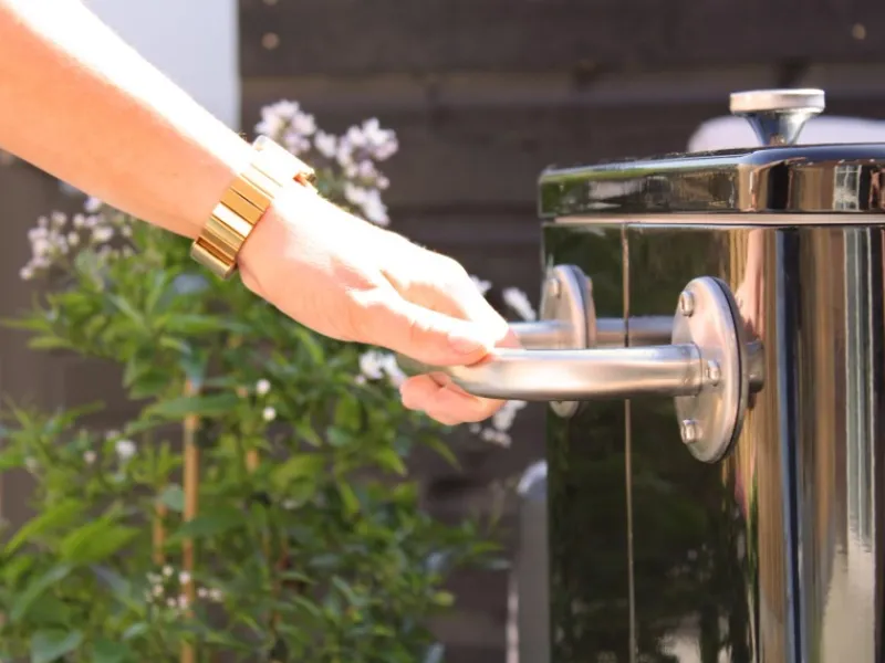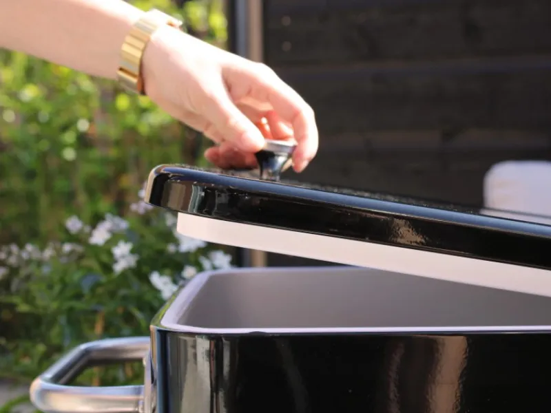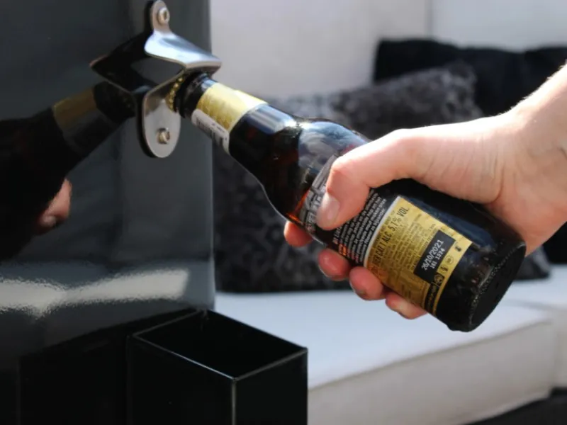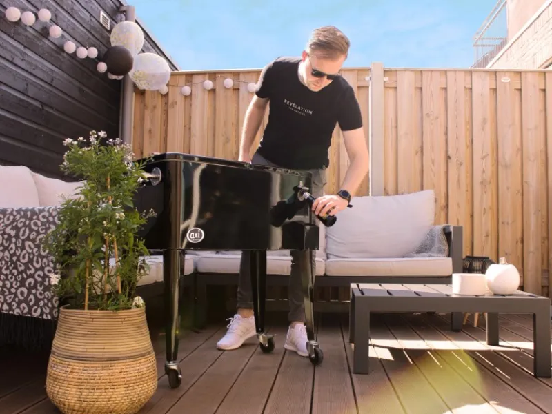 Der Deckel des Axi Kühlwagens kann auf beiden Seiten geöffnet oder ganz abgenommen werden. So können Sie problemlos Bier auf der linken Seite oder Weißwein auf der rechten Seite entnehmen. Der an der Vorderseite angebrachte Flaschenöffner ermöglicht das Öffnen von Flaschen mit nur einer Handbewegung, während die Kappe in den dafür vorgesehenen Behälter gelegt werden kann.