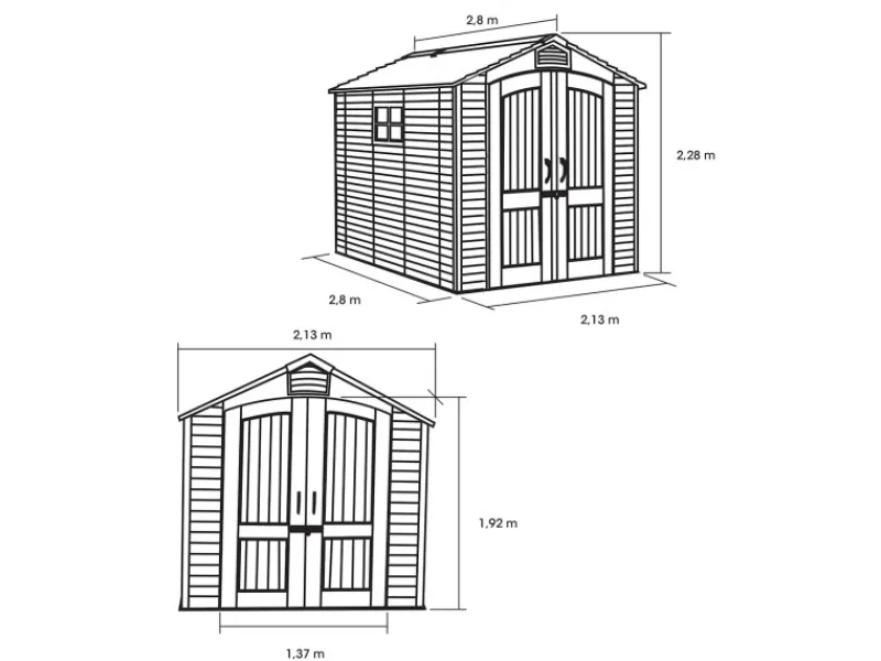 Das Gerätehaus verfügt über eine robuste Konstruktion, mit einer Wandstärke von 26 mm. Die maximalen Schneelast des Satteldachs liegt bei 195 kg/m. Die Firsthöhe beträgt 227 cm, wodurch eine angenehme Kopffreiheit im Innenraum gegeben ist. Es ist aus wetterfestem Kunststoff gefertigt, wodurch es besonders robust und pflegeleicht ist. Der Boden ist bereits im Lieferumfang enthalten.