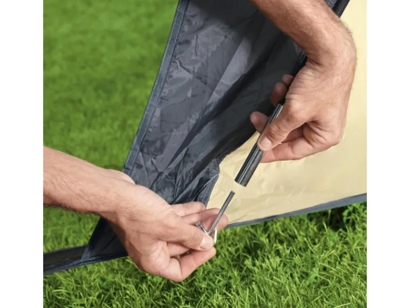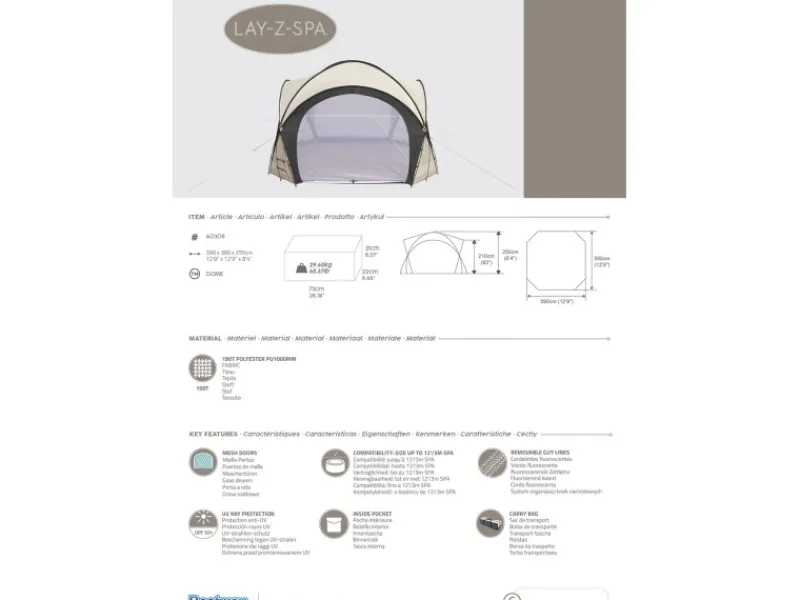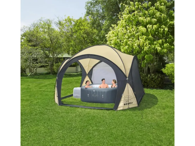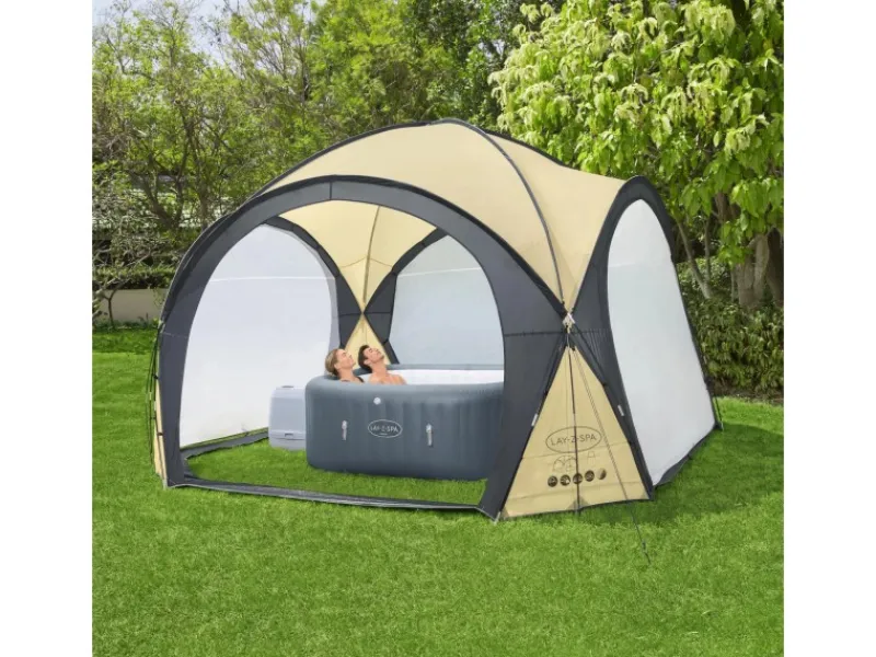 Der Pavillon verfügt über ein robustes Gestell mit abnehmbaren Stoffteilen und kann ganzjährig aufgestellt bleiben. Aufgebaut wird der Pavillon ähnlich wie ein Zelt. Mit 2 Personen gelingt der unkomplizierte Aufbau in ca. 15 Minuten. Das Lay-Z-Spa-Zelt ist passend für alle Spa-Modelle von Bestway, kann aber auch als Poolpavillon für runde Aufstellpools mit einem Durchmesser bis 366 cm genutzt werden.
