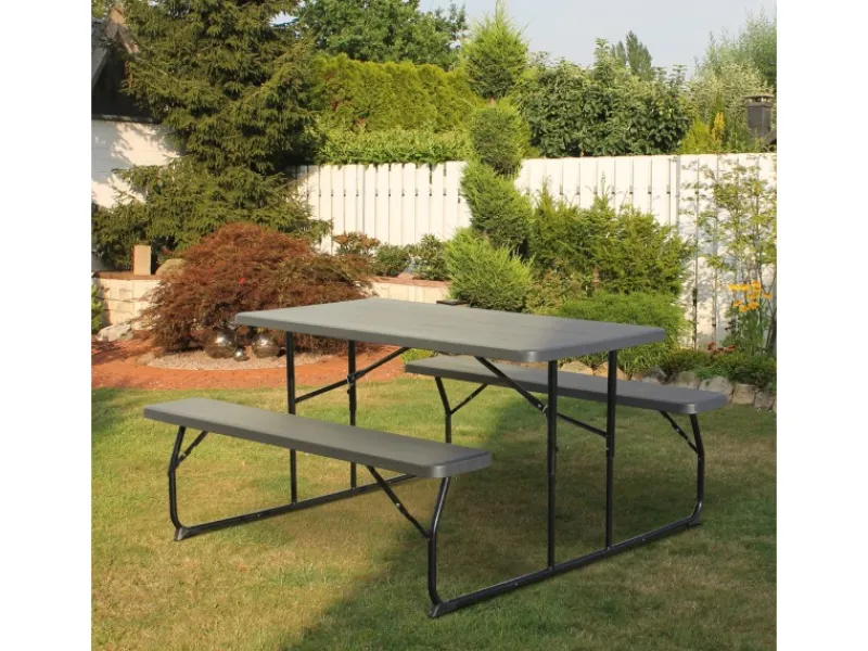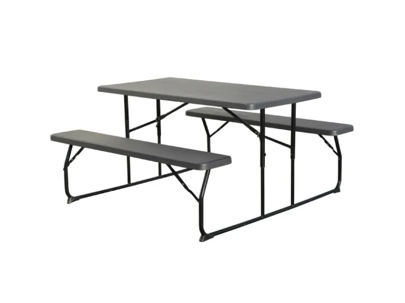 – Tischplatte und Sitzfläche: HDPE-Kunststoff, anthrazit mit Holzstruktur