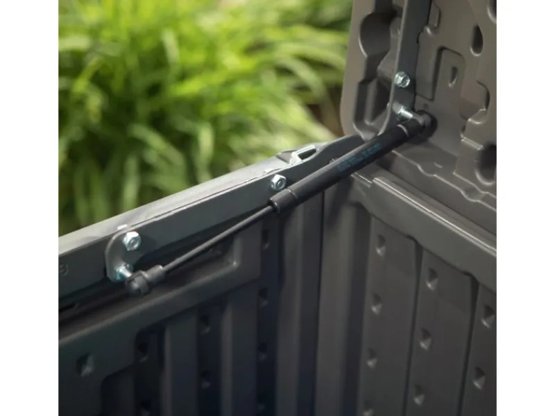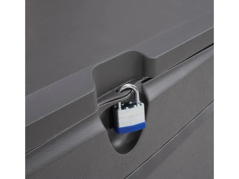 Integrierte Gasdruckdämpfer machen es besonders einfach, die Auflagenbox zu öffnen und zu schließen. Die Dämpfer halten den Deckel in einem Winkel von 90° aufrecht, sodass das Ein- oder Ausräumen einfacher gelingt. Zum Schließen drücken Sie den Deckel bequem herunter. Dank einer Vorrichtung für ein Vorhängeschloss können Sie die Gartenbox auch abschließen und wertvolle Gegenstände vor Diebstahl schützen.