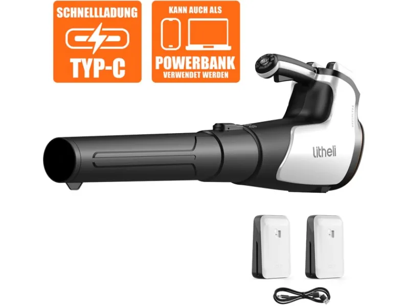 Der Laubbläser wird mit einem 40 V-Lithium-Ionen-Akku betrieben. Die IPS Super Battery liefert eine optimal abgestimmte Leistung mit einer Kapazität von 4,0 Ah und ist mit allen Produkten der Litheli U20-Serie kompatibel. Lade den Akku über den 45-W-USB-C-PD-Anschluss auf. Der Akku dient dabei auch als Powerbank zum Aufladen digitaler Geräte wie Laptops, Telefone und Drohnen.