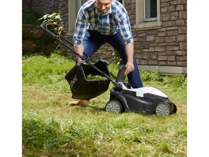 Der klappbare Griff ermöglicht eine vertikale, platzsparende Lagerung. Zudem ist der Griff ergonomisch und belastet dadurch Arme und Rücken während der Arbeit weniger. Außerdem hat der Mäher einen 30 l großen Textil-Fangkorb. Das vereinfacht dir das Entleeren und Auffangen des Schnittguts.