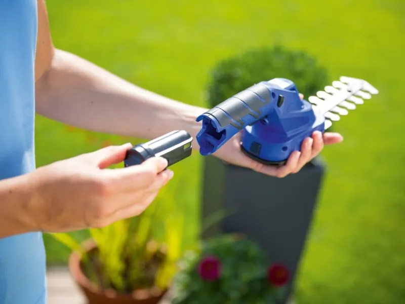 Der hochwertige, tauschbare 3,6 V Li-Ionen Markenakku ist aus dem Hause Samsung. Die Schere entspricht den neuesten Sicherheitsvorgaben und wird somit inklusive einem herausnehmbaren Akku geliefert, der außerhalb geladen wird. Die Arbeitszeit pro Akkuladung beträgt ca. 45 min.