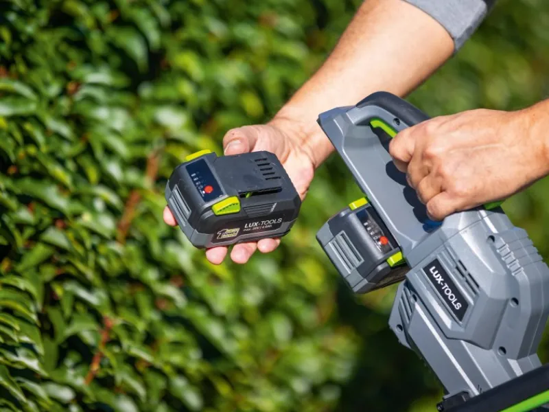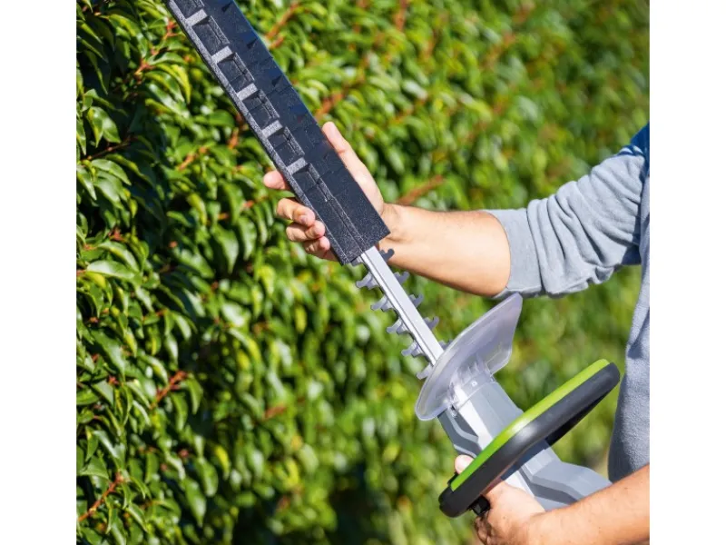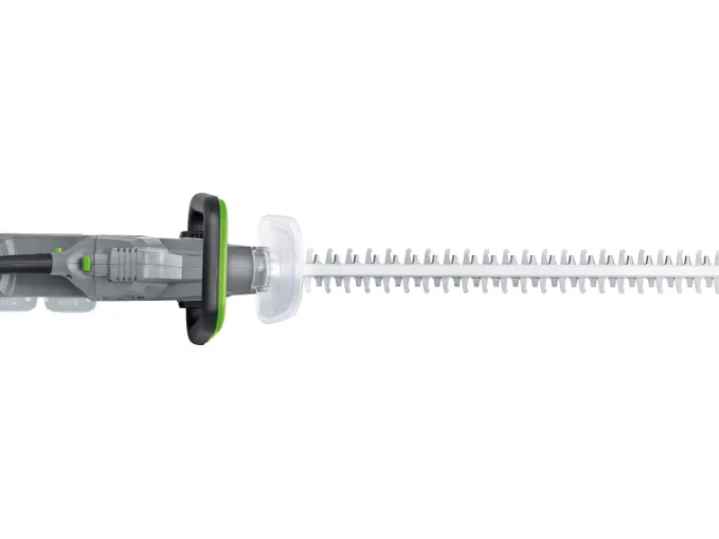 Die Akku-Heckenschere besitzt beidseitig schneidende Messer und zeichnet sich durch eine Schnittlänge von 65 cm aus. Die maximale Schnittstärke liegt bei 24 mm. Damit lässt sich der Heckentrimmer optimal für breite Hecken einsetzen. Insgesamt ermöglicht es 2.800 Schnitte pro Minute. Die elektronische Sicherheitsbremse bietet eine sichere Arbeitsweise. Der Anschlagschutz am Messerende schützt den Bediener vor Rückschlag, vor allem wichtig bei bodennahem Schneiden.