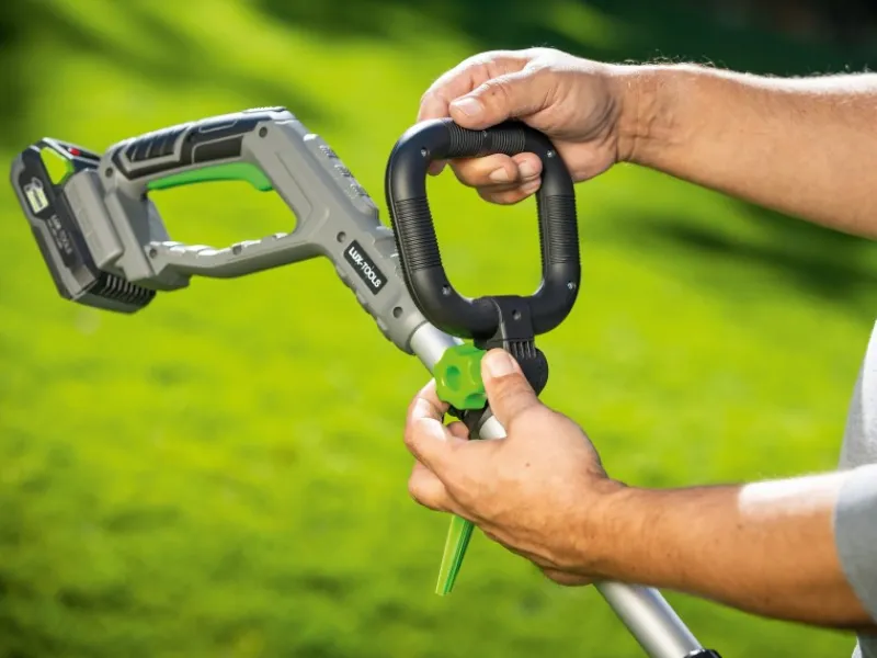 Zusätzlich ist der Akkutrimmer teleskopierbar. Durch diese bequeme Höhenverstellung lassen sich körperliche Größenunterschiede ausgleichen. Ein weiteres Feature ist der Zusatzhandgriff, der dir das Führen mit zwei Händen erlaubt und ein komfortables Arbeiten unterstützt.
