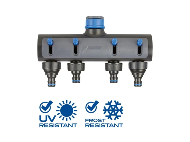 Das Wasserverteilsystem ist für einen Hahnanschluss der Größe 26,4 mm (G 3/4) geeignet. Dazu besitzt das Anschlussstück ein Innengewinde. Die Schlauchanschlüsse sind in der Größe 33,13 mm (G 1) ausgeführt. Ihre Schnellverschlüsse bieten eine Komptabilität mit entsprechenden Gegenstücken. Gefertigt ist der 4-Wege-Verteiler aus langlebigem Kunststoff. Er bietet Ihnen wasserabweisende sowie UV- und frostbeständige Eigenschaften. Zudem besticht das System durch sein leichtes Gewicht, das keine zusätzliche Befestigung erfordert. Dank seiner griffigen Oberfläche gestaltet sich die Handhabung denkbar einfach.