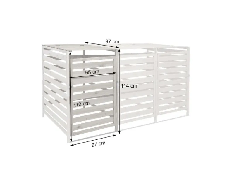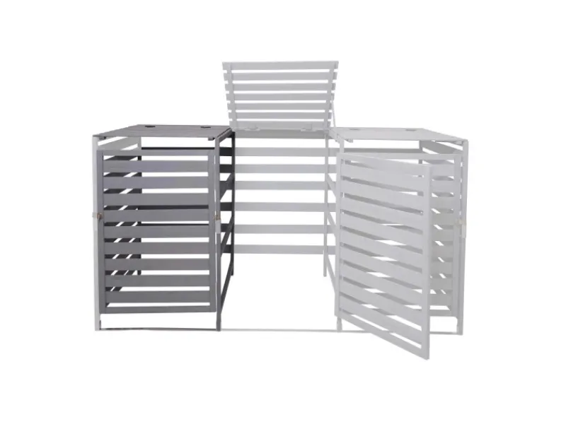 Jedes Abteil ist für handelsübliche Mülltonnen mit einem Fassungsvermögen von 80 bis 240 Litern ausgelegt. Der Deckel ist mit einer Halterung ausgestattet, damit bleibt er offen stehen und erleichtert Ihnen das Befüllen der Mülltonnen. Beide Türen sind getrennt abschließbar. Um ausreichend Stabilität sicherzustellen, sollte diese Mülltonnenverkleidung am Boden verankert werden. Im Lieferumfang sind keine Befestigungsteile enthalten.