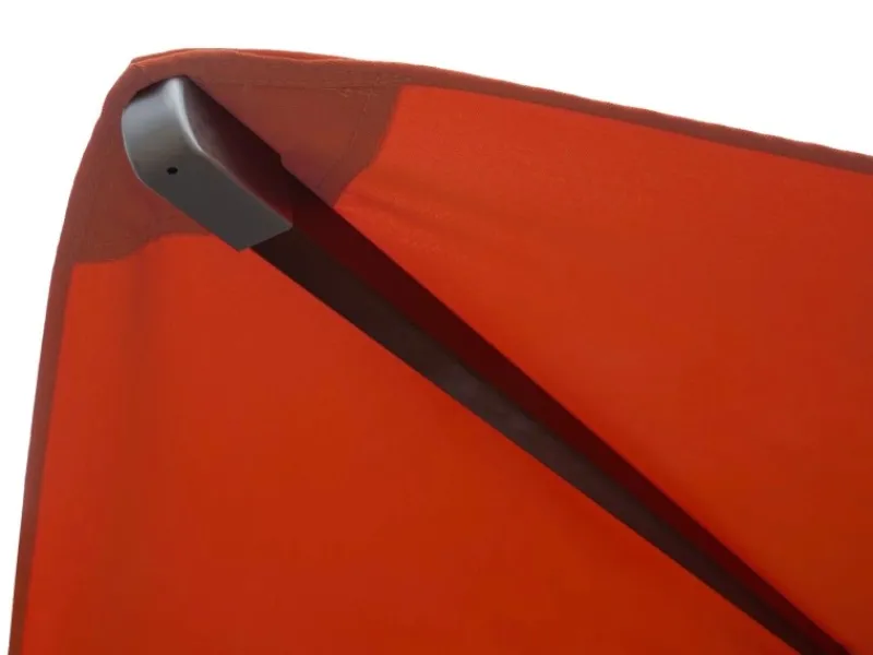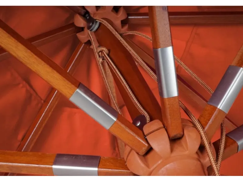 Der massive Holzmast und die mit Aluminium verstärkte Verstrebung tragen zu einem sicheren Stand bei. Durch das Winddach kann die Luft zirkulieren und der Schirm wird nicht zum gefährlichen Windfang. Auch bei einem leichten Regenschauer können Sie in Ruhe sitzen bleiben. Dafür sorgt der wasserabweisende Stoff aus gewebtem Polyester (Spun Poly). Dieser ist gegenüber einem normalen Polyester-Baumwollgemisch doppelt so langlebig, formstabil, atmungsaktiv, waschbar und muss nicht gebügelt werden. Das Mastende ist durch eine ca. 40 cm lange Aluminiumhülse ummantelt, welche ein Eindringen von Feuchtigkeit in das Holz verhindert. Der Schirm ist damit sowohl in einer Bodenhülse, als auch in einem Schirmständer bedenkenlos nutzbar.