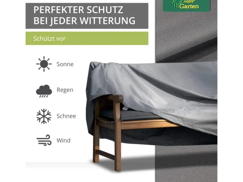 WASSERDICHT: Dank innenseitiger PVC-Beschichtung sowie versiegelter Nähte ist die Gartenbank-Abdeckplane wasserdicht. Seitliche Ventilationsöffnungen sorgen für ausreichende Belüftung und beugen so Schimmelbildung vor SCHUTZ VOR UV-STRAHLUNG: Mit hoher Farbechtheit durch das durchgefärbte Gewebe mit Lichtechtheitsstufe 6 ist die Gartenbank-Hülle vor schnellem Verschleiß und Ausbleichen durch UV-Strahlung geschützt LANGLEBIG UND WINTERFEST: Das Gewebe der Schutzhülle für Gartenmöbel ist reißfest sowie frostbeständig ‚ Sie können Ihre Bank also das ganze Jahr geschützt draußen stehen lassen GEPRÜFTE QUALITÄT: Das Material unserer Gartenbank-Abdeckung wird regelmäßig durch die öffentliche Prüfstelle für das Textilwesen der Hochschule Niederrhein GmbH getestet EINFACHE HANDHABUNG: Durch das robuste Material der Gartenmöbel-Hülle ist die Abdeckhaube praktisch in der Anwendung. Einfach überwerfen und mit der Kordel sowie dem Stopper befestigen