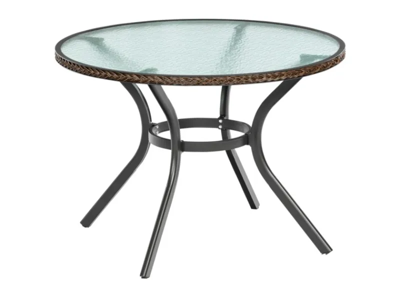 Mit einem Durchmesser von 100 cm bietet der Tisch Platz für bis zu vier Personen. Ein besonderer Hingucker ist der Rand der Tischplatte, die mit einem Geflechtrand aus Kunststoffgeflecht überzeugt.