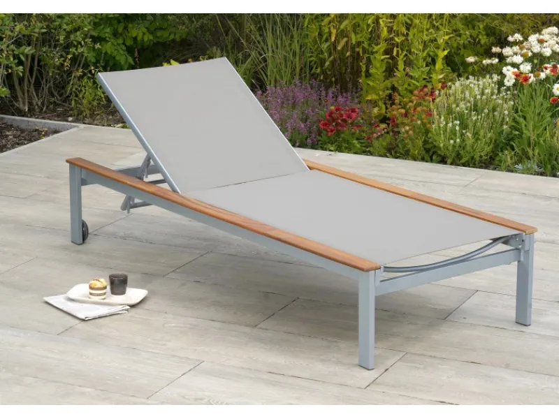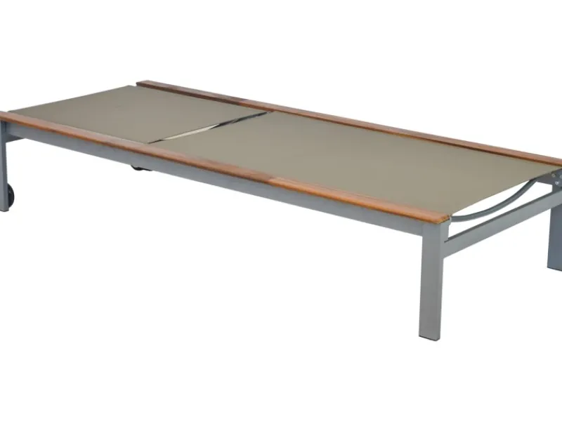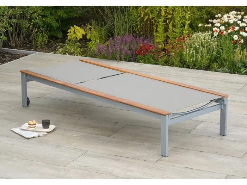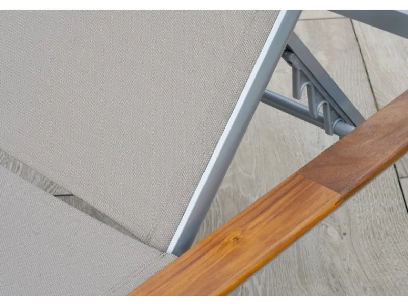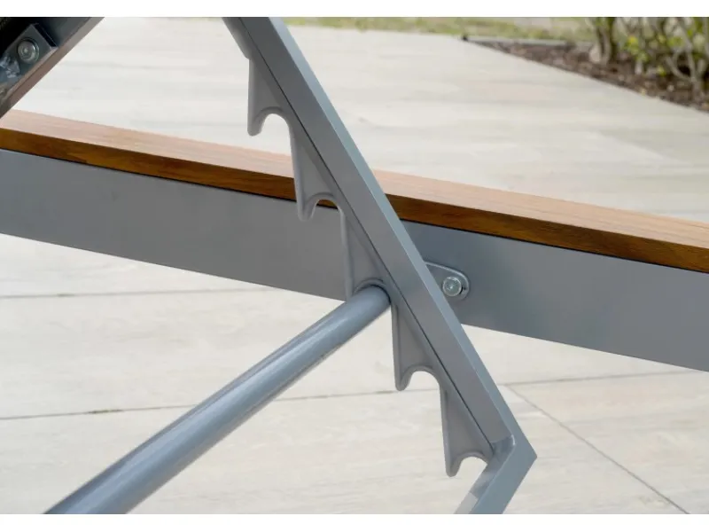 Die Naxos-Liege besteht aus einem pulverbeschichteten Aluminiumgestell, einer Textilbespannung und geöltem Akazienholz.