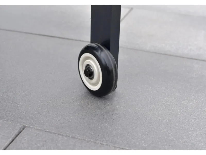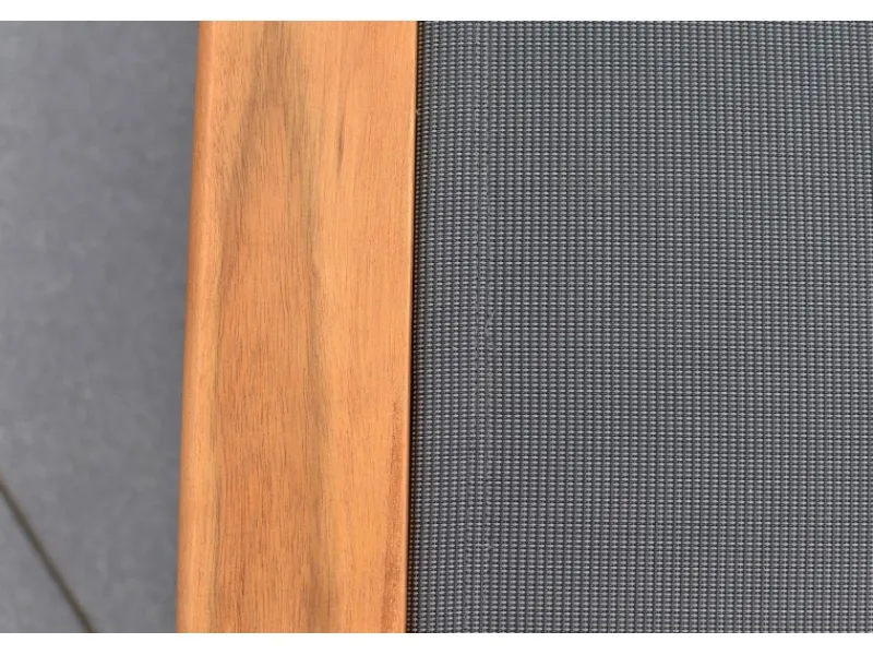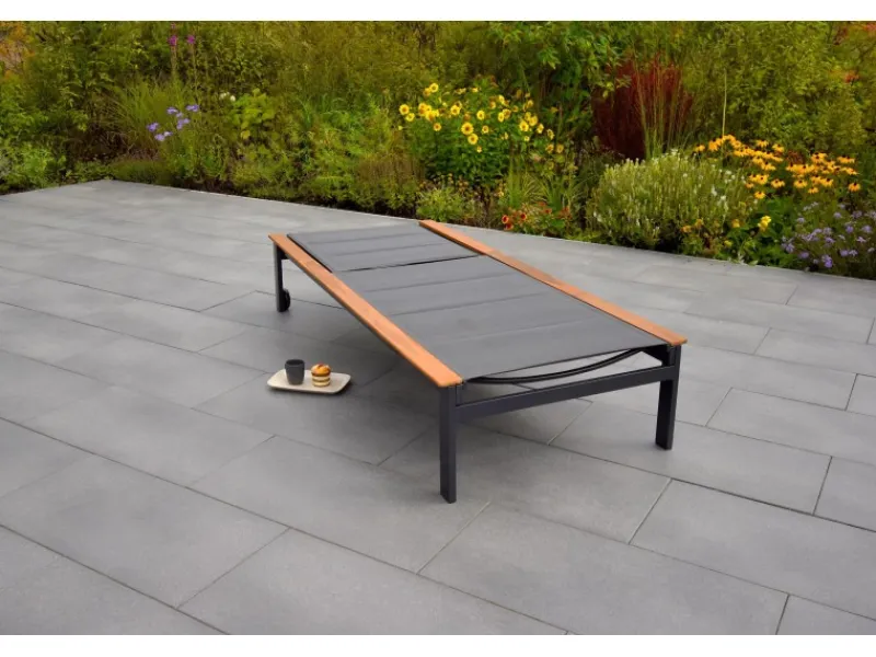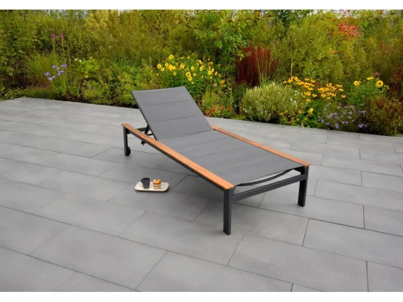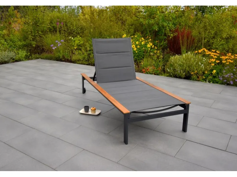 Die Paxos Liege besteht aus einem pulverbeschichteten Aluminiumgestell, einer gepolsterten Textilbespannung und geöltem Akazienholz.