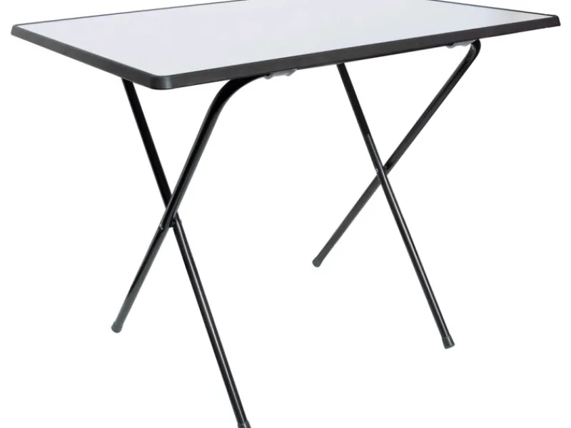 Der Campingtisch Scherentisch hat eine Größe von 80x60x64 cm. Das Gestell ist aus pulverbeschichtetem Stahl in der Farbe anthrazit. Die Tischplatte aus kunststoffbeschichteten Alcotop hat die Fabe weiß. Der Tisch ist empfohlen für max. 2 Personen. Made in Germany.