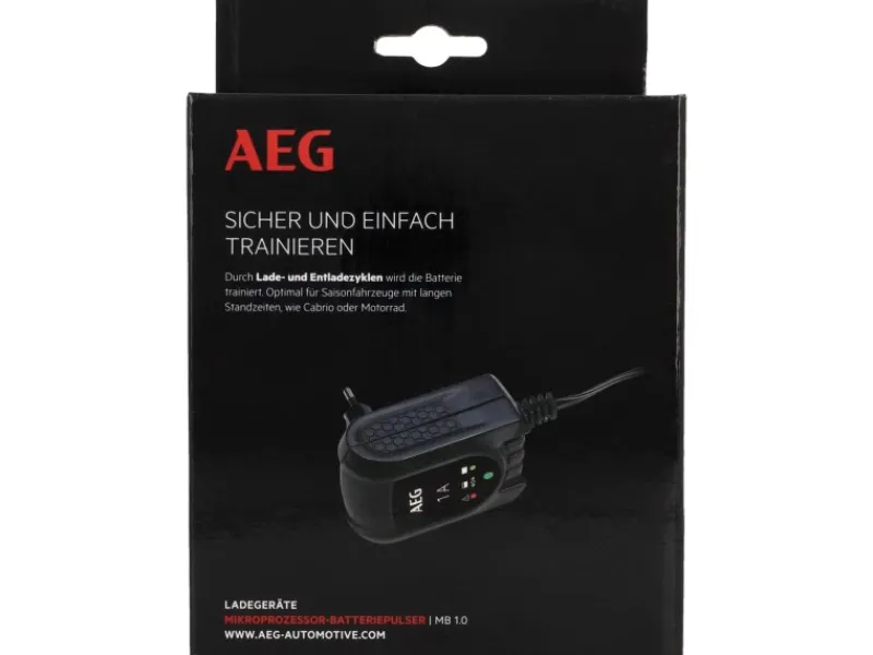 Der AEG Batteriepulser hat eingebaute Sicherheitsfunktionen gegen Kurzschluss (defekte Batterie), Falschanschluss (Anschluss mit umgekehrter Polarität) und Überladung.