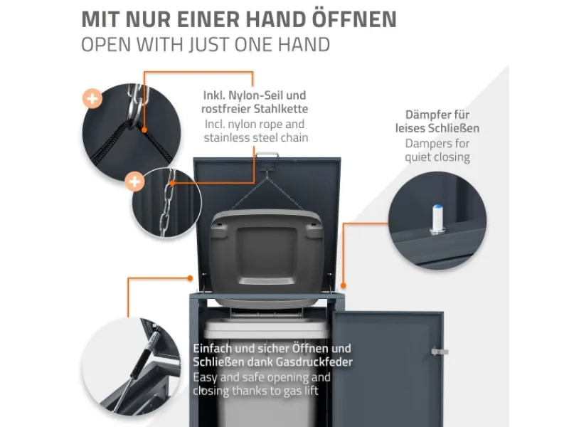 Deckel und Mülltonnendeckel öffnen sich zeitgleich nach Befestigung des mitgelieferten Seils