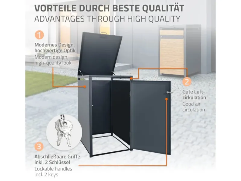 Mülltonnen im Eingangsbereich machen oftmals keine schöne Figur. Mit den praktischen Mülltonnenboxen hast du eine smarte und komfortable Lösung, die unschönen Mülltonnen verschwinden zu lassen. Die Mülltonnenboxen sorgen für Ordnung und bieten zusätzlich noch Schutz vor Fremdeinflüssen. Es passen alle gängigen Mülltonnen von 60 Liter, 120 Liter oder 240 Liter.