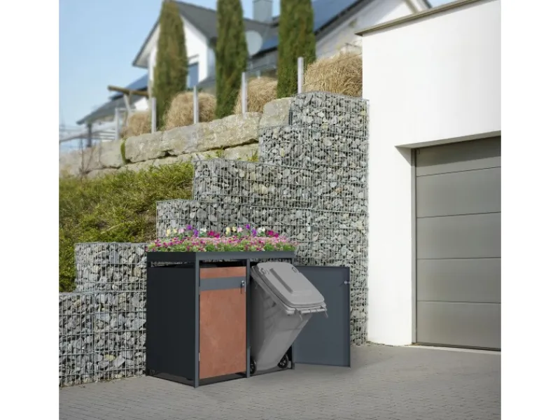 Diese Mülltonnenbox besteht aus Stahlblech und einem Rahmen, wodurch sie äußerst robust und rostfrei ist. Zudem erhält die Mülltonnenbox eine Pulverbeschichtung mit Struktur im Farbton Anthrazit-grau. Zudem ist die Pulverbeschichtung kratzunempfindlich.