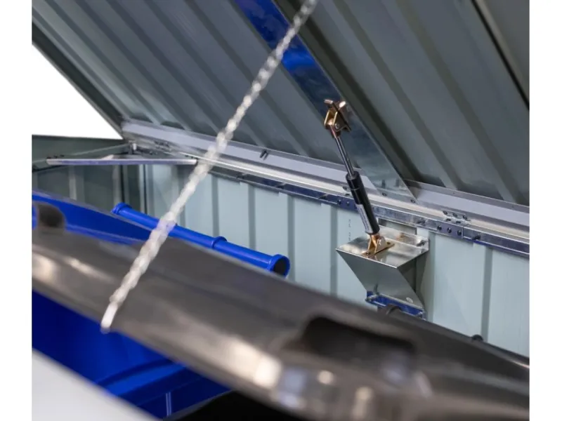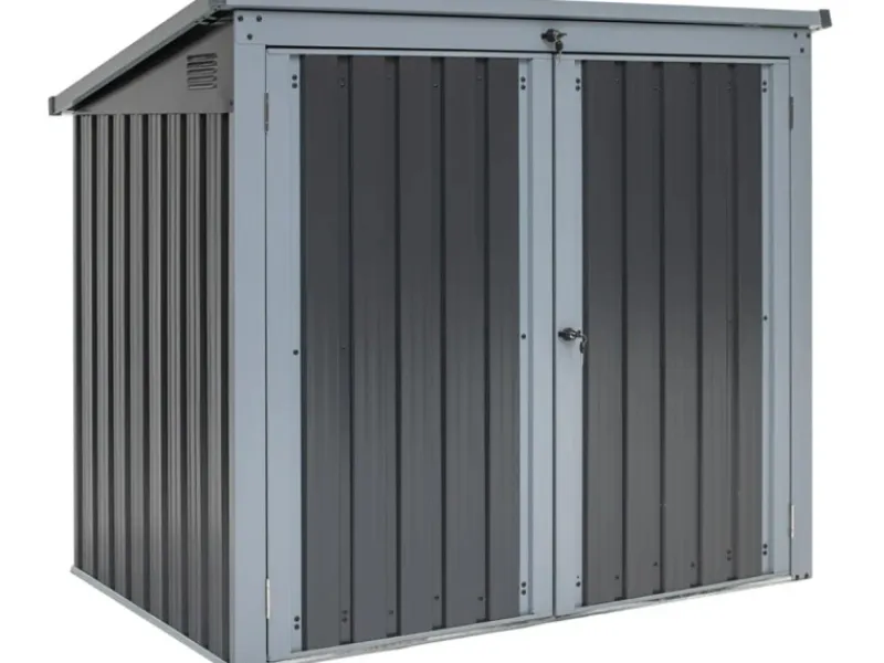 Mit der Westmann Müllbox ist alles sicher verstaut.Diese robuste Mülltonnenbox aus Stahl bietet Platz für zwei 240 Liter Mülltonnen. Das starke und galvanisch verzinkte Blech ist wetterfest, langlebig und kratzunempfindlich. Die belastbare Konstruktion wird zusätzlich durch Profilstreben gestärkt und bietet dadurch eine enorme Stabilität.Müheloses und sicheres Öffnen des Deckels mithilfe von Gasdruckfedern. Extra breite Tür (BxH 135×124 cm) für einfachen Zugang und bequemes rangieren von Mülltonnen.Das moderne Pultdach mit seitlich eingearbeiteter Belüftung lässt Regenwasser nach hinten ablaufen und verhindert das Ansammeln von zu viel Schnee und Wasser.Universell auch als Lagerraum für Spielsachen oder Poolzubehör verwendbar. Verstaute Utensilien können Sie durch das integrierte Schloss und einem dazugehörigen Schlüssel sicher verstauen und einschließen.Einfacher Aufbau durch übersichtliche Bausatzsysteme und der bebilderten Aufbauanleitung.