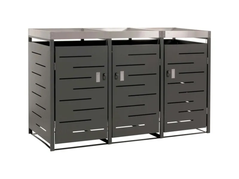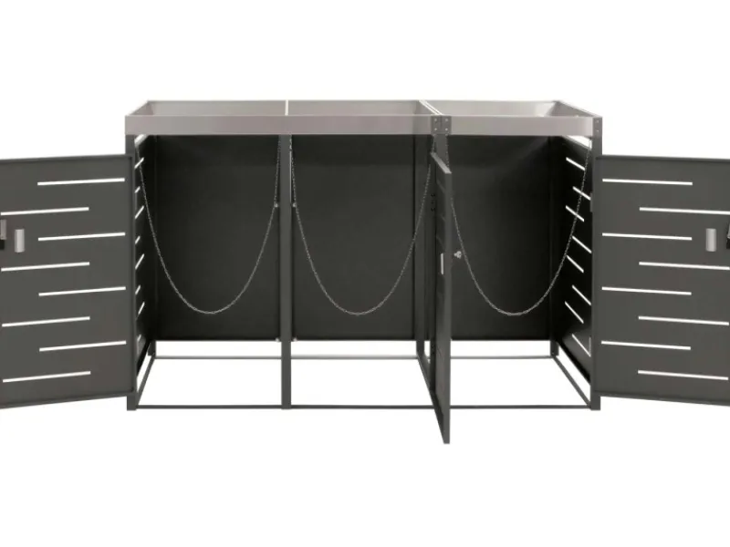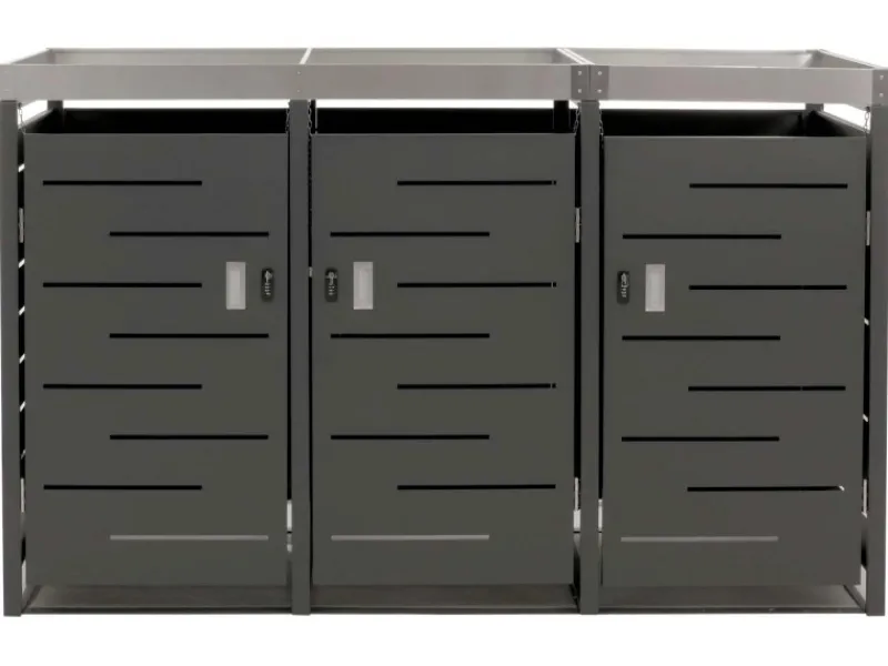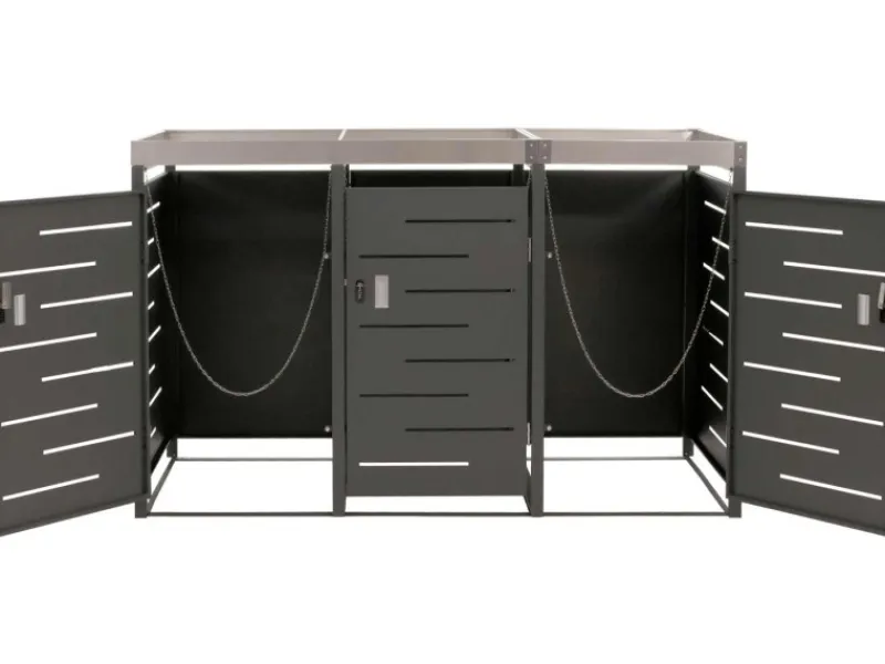 Diese Mülltonnenverkleidung verbindet modernes Design mit praktischen Funktionen. Durch den stabilen Aufbau und die abschließbare Tür sind Deine Mülltonnen sicher geschützt. Gleichzeitig sorgt der Pflanzkasten für ein dekoratives Element in Deinem Außenbereich. Die Belüftungsschlitze tragen dazu bei, dass Kondenswasser vermieden wird, während die wetterbeständige Konstruktion Langlebigkeit garantiert.