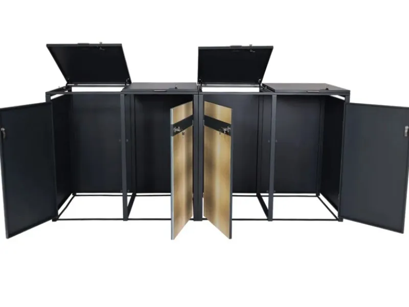 Diese Mülltonnenverkleidung überzeugt durch modernes Design, praktische Funktionen und hohe Sicherheit. Dank der Gasdruckfedern lassen sich die Deckel einfach öffnen, während die separate Abschließbarkeit der Türen und Deckel Deine Mülltonnen zuverlässig schützt. Die Belüftungsschlitze sorgen dafür, dass Kondenswasser vermieden wird, und die wetterfeste Pulverbeschichtung garantiert Langlebigkeit. Ideal, um Deinen Außenbereich sauber und ordentlich zu gestalten.