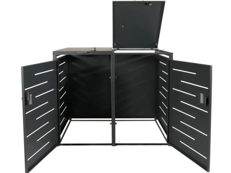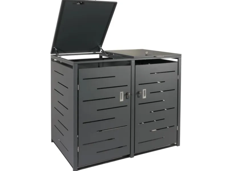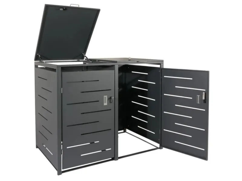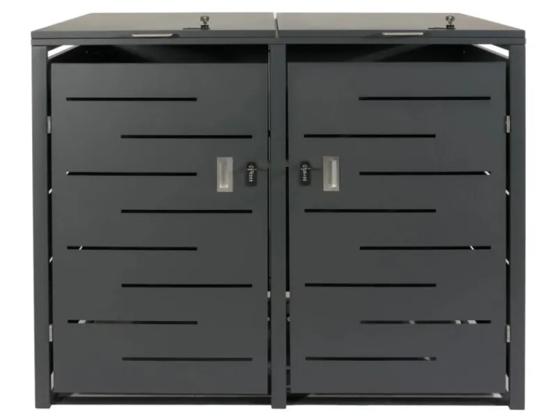 Diese Mülltonnenverkleidung verbindet modernes Design mit praktischen Funktionen. Durch die komfortable Aufhängung lässt sich die Mülltonne einfach befüllen, während der stabile Aufbau und die abschließbaren Elemente für Sicherheit und Ordnung sorgen. Die wetterbeständige Konstruktion macht sie ideal für den Außenbereich, und die Erweiterbarkeit ermöglicht eine flexible Nutzung nach Deinen Bedürfnissen.