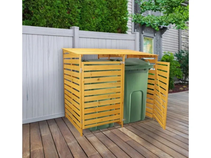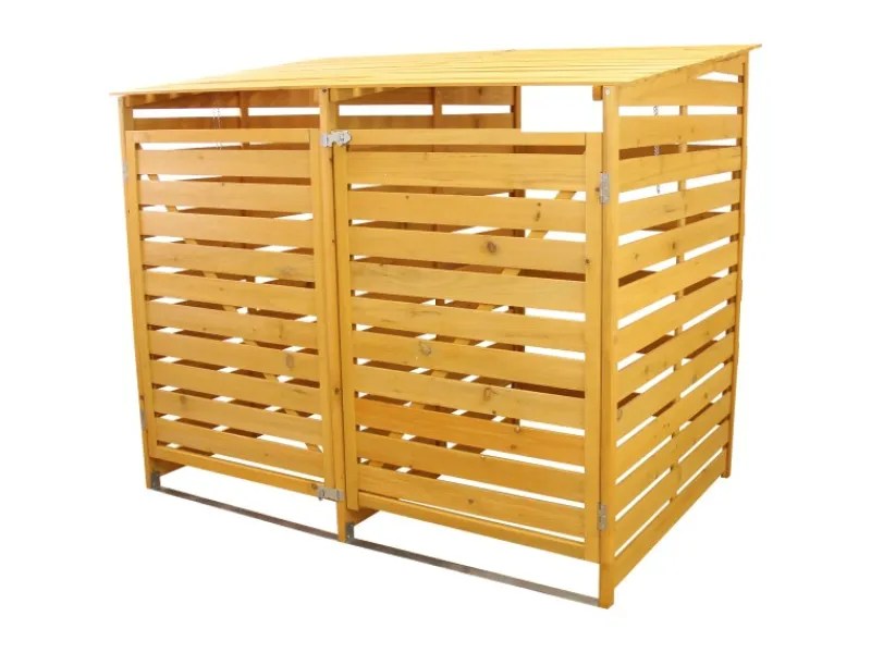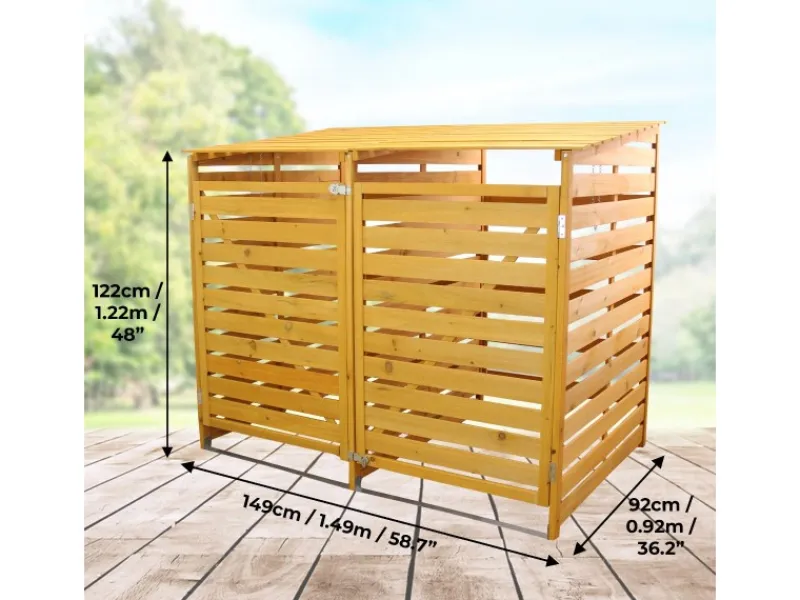 Mit dieser schönen Holz-Mülltonnenverkleidung von MonsterShop können Sie ein stilvolles Merkmal aus Ihren beiden sonst gewöhnlichen 240L-Behältern mit Rollen erstellen.Unsere Mülltonnenverkleidung ergänzt alle Außenbereiche und bietet Ihnen einen schönen Garten, während Ihre Mülltonnen immer noch an einem praktischen Ort aufbewahrt werden.Der Rahmen besteht aus starkem, langlebigem Douglasienholz und ist mit einem Lamellen-Design gebaut, dadurch kann die Luft durch den Bereich strömen und einen frischen Geruch durch Ihren Garten beibehalten.Die Mülltonnenverkleidung ist perfekt für die Lagerung von zwei Standard-Mülltonnen mit Rollen ausgelegt. Aber seine Vielseitigkeit zeigt sich auch bei der Lagerung anderer Gegenstände wie Brennholz oder Ihrer unverzichtbaren Gartengeräte.Die zwei großen Türen an der Vorderseite ermöglichen einen aüßerst einfachen Zugang, um das Entfernen der Mülltonnen zu einem Kinderspiel zu machen. Geschlossene Vordertüren ermöglichen das Anbringen eines Vorhängeschlosses für zusätzliche Sicherheit. Mit dem praktischen Befestigungsset können Sie die Mülltonnenverkleidung auch an einer Wand oder einem Zaun befestigen.Produktmerkmale:Starkes und langlebiges Holzlager für Mülltonnen.Perfekt für 2 x 240-Liter-Mülltonnen.Abschließbare Türen für Sicherheit.Praktische zugängliche Deckel.Kommt flach verpackt mit schnellem und einfachem Zusammenbau.Doppelt als Lagerung für Gartengeräte/Brennholz.Kostenloses Befestigungsset zur Befestigung an der Wand/am Zaun.Spezifikationen:Höhe: 1220mm / 122cm / 1,2mBreite: 1490mm / 149cm / 1,49mTiefe: 920mm / 92cm / 0,92mGewicht: 25 kgFarbe: BraunMaterial: FichtenholzStil: Outdoor, GartenMontage erforderlich: JaFlach verpackt: JaAnzahl der Türen: 2Anzahl der Schlösser: 2Kapazität: 2 x Mülltonnen mit RollenWas ist enthalten:Langlebige doppelte MülltonnenverkleidungKostenloses praktisches Befestigungsset