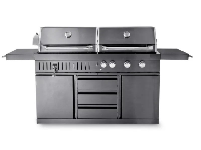 Ein großer Grill für den echten Grill-Fan! Topmoderner Grill für ein einzigartiges Kocherlebnis. Freistehendes Modul mit praktischer 2-in-1-Lösung, bei dem Sie einen Gas- und einen Holzkohlegrill erhalten, für Abwechslung oder zur gleichzeitigen Verwendung. Ein eindrucksvoller und robuster Grill der Spitzenklasse für den Platz im Freien, mit puristischem und luxuriösem Design komplett in Anthrazit – 304 SS. Die Grills bieten einzigartige Funktionen und zwei Grillflächen von 63 x 46 cm, die zwei Grillarten gleichzeitig ermöglichen. – Sie bekommen den absolut heißesten Grill in der Nachbarschaft!