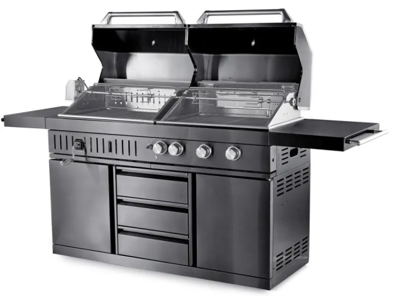 Zweifellos ein Traumgrill, der bei jeder Gelegenheit draußen genutzt werden kann. Er bietet unglaublich viele Möglichkeiten und Funktionen. Nach Belieben können Sie gleichzeitig über der perfekten Gasflamme oder einem glühenden Holzkohlebett grillen. Beide Grills haben doppelwandige Deckel mit robusten Griffen und eine integrierte Temperaturanzeige.. Unter den Grills befindet sich sich breiter Stauraum mit Schrankfach und Schubladen.