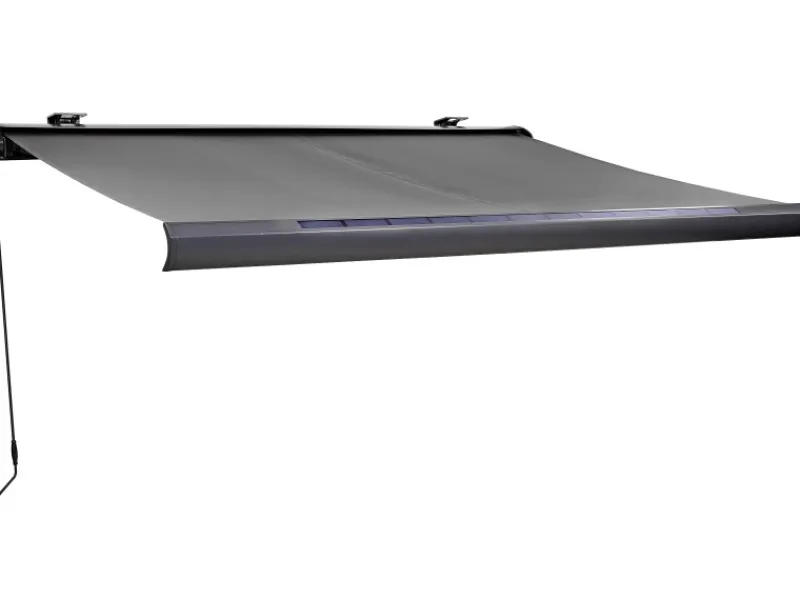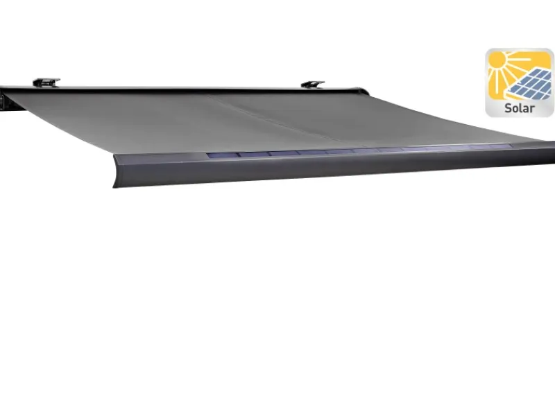 Das pulverbeschichtete Aluminiumgestell bietet eine hohe Stabilität und eine besonders einfache Handhabung. Dank robuster und zuverlässiger Hochschlagsicherung werden selbst bei starken Windstößen Beschädigungen an der Solarmarkise vermieden. Die Bedienung der Vollkassettenmarkise ist dank modernster Technik besonders einfach. Diese wird über eine Funkfernbedienung bequem in einem Neigungswinkel von 0° bis 30° stufenlos ein- und ausgefahren. Bei Bedarf kann die Markise auch manuell per Kurbelstange ein- und ausgefahren werden.