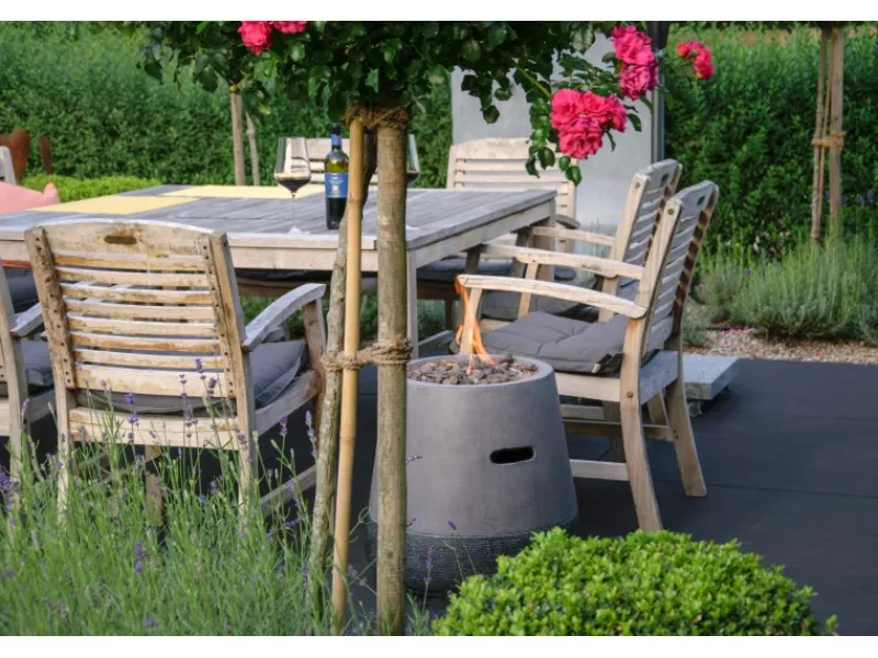 Die Steine sind ein hervorragender Wärmespeicher und verbreiten langanhaltende, angenehme Wärme, sobald sie erhitzt werden. Die Feuerschale wird mit Propangas betrieben und verfügt über einen elektrischen Anzünder, der über eine AAA-Batterie betrieben wird. Ein automatischer Abschaltmechanismus garantiert maximale Sicherheit bei der Benutzung der Feuerschale. Zu dieser gehören eine Polyester-Abdeckung, ein Gasschlauch mit Regler und ein Metallständer.