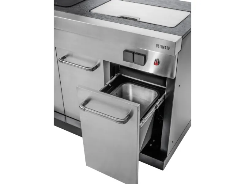 Für Lebensmittelreste und andere Abfälle, die beim Grillen oder Kochen anfallen ist ein ausfahrbarer Abfallbehälter integriert. So können Sie die Arbeitsfläche stets sauber halten. Das Spülbecken mit Wasserhahn ist vollfunktionsfähig und sorgt für fließendes Wasser beim Grillen. Es bietet Ihnen somit eine nahegelegene Möglichkeit Salat, Gemüse und andere Lebensmittel vor der Zubereitung abwaschen. Auch zum Spülen von Geschirr und Besteck oder zum einfachen Händewaschen bietet die Außenspüle eine praktische Gelegenheit.