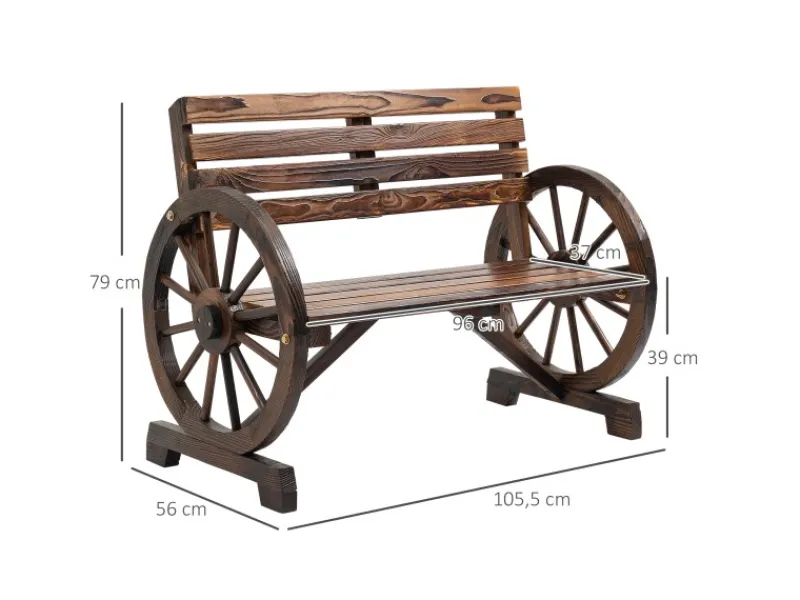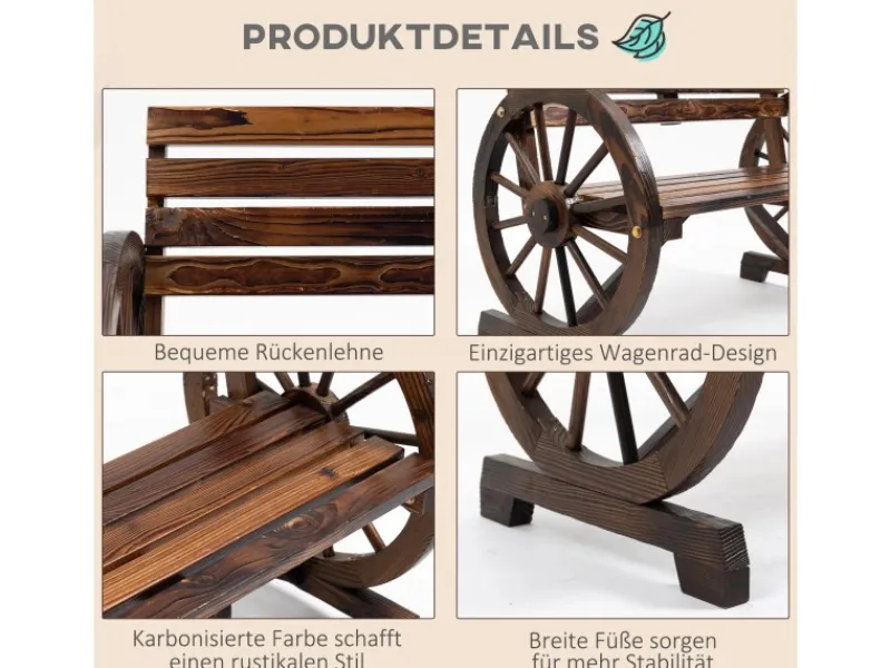 Vervollständigen Sie Ihre Terrasse oder Ihren Garten mit dieser rustikalen Gartenbank von Outsunny, auf der Sie sitzen und sich ausruhen können, während Sie Ihren Lieblingsplatz im Freien genießen. Diese aus massivem Tannenholz gefertigte Bank ist robust gefertigt, damit sich bis zu zwei Personen in der Sonne oder im Schatten entspannen können. Die beiden Armlehnen verfügen über ein einzigartiges Wagenrad-Design, das Platz für Ihre Arme bietet und diese Bank sicher zum Gesprächsgegenstand macht. Beschreibung: Gartenbank im Landhausstil, ideal für Terrasse, Garten und den generellen Außenbereich Design-Highlight: Wagenräder bilden Beine und Armlehnen Massives Tannenholz für einen authentischen Look und Langlebigkeit Viel Platz zum Ausruhen dank großer Rückenlehne und Sitzfläche Mit bis zu 240 kg belastbar Technische Daten: Material: Tannenholz Farbe: Braun Gesamtmaße: L105,5 x B56 x H79 cm Sitzgröße: L96 x B37 cm Sitzhöhe: 39 cm Maße Rückenlehne: B96 x H28 cm Durchmesser pro Rad: 56 cm max. Belastbarkeit: 240 kg Lieferumfang: 1 x Gartenbank 1 x Montageanleitung