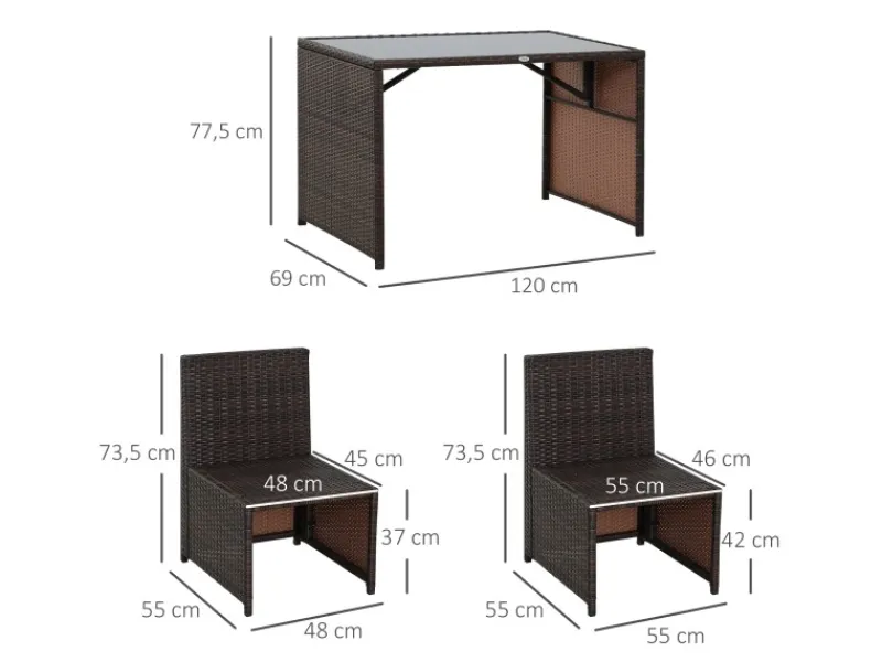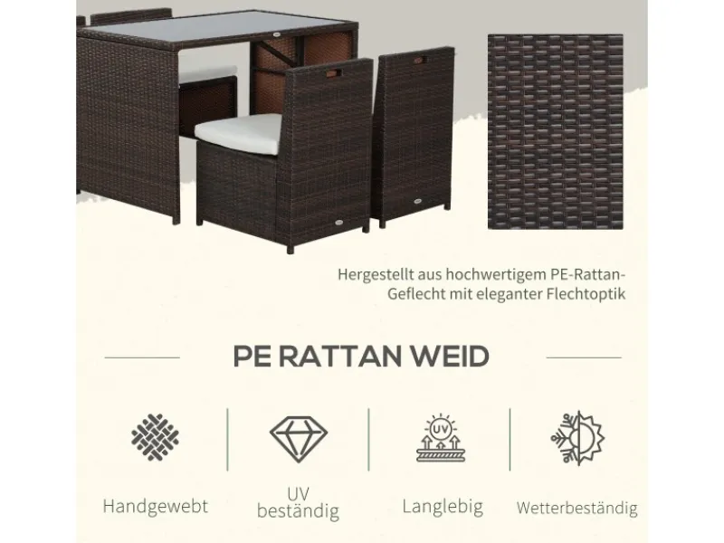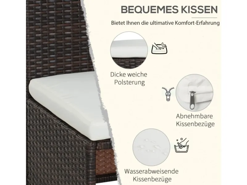 Dieses 5-teilige Gartenmöbelset von Outsunny ist von einem langlebigen, unempfindlichen Polyrattangeflecht umhüllt, das äußerst witterungsbeständig und robust ist, sodass die Garnitur sich ideal für die dauerhafte Verwendung im Freien eignet. Die Tischplatte besteht aus stabilem Sicherheitsglas und ist besonders pflegeleicht. Dank der großzügigen Polsterung und der vier Kissen, können Sie sich bequem fallenlassen und die Ruhe Ihres Gartens mit einem heißen Getränk und viel Komfort genießen.
