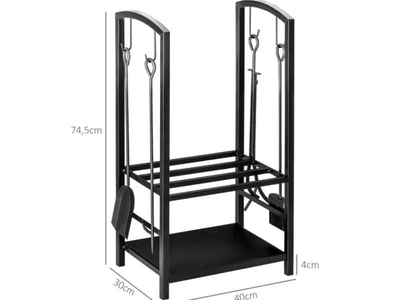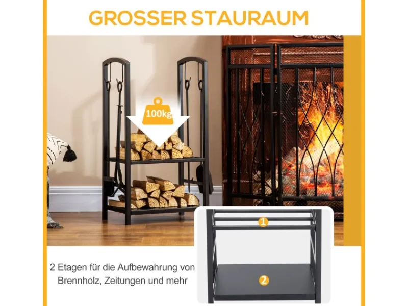 Mit diesem HOMCOM Kaminholzständer brauchen Sie sich keine Gedanken mehr über die sichere Lagerung Ihres Feuerholzes zu machen. Dieses praktische Regal bietet reichlich Platz für Brennholz, Kaminanzünder und weiteres Zubehör. Auch die Belastbarkeit mit bis zu 100 kg kann sich sehen lassen! Zusätzlich erhalten Sie ein 4-teiliges Kaminbesteck, bestehend aus Besen, Schaufel, Schürhaken und Zange. So schützen Sie Ihr Brennholz vor Bodenfeuchtigkeit und können sich vor dem Kamin gemütlich entspannen.