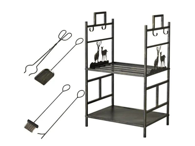 Mit dem schmiedeeisernen Kaminholzregal von Outsunny haben Sie den ganzen Tag lang genügend Brennholz zur Hand, um Ihren Kamin zu befeuern. Das Kaminholzregal ist mit einer schwarz-goldenen Pulverbeschichtung im Antik-Look versehen. Sie macht das das Regal rost- und wetterbeständig, so dass Sie es auch gut im Außenbereich nutzen können. Das Regal verfügt über zwei große Ablagen und trägt ein Maximalgewicht von 30 kg. Zum Set gehört ein vierteiliges Kaminbesteck, bestehend aus Schaufel, Schürhaken, Zange und Besen. Sie können an vier seitlichen Haken am Regal aufgehängt werden. Für gemütliche Abende vor dem Kamin oder an der Feuerstelle im Garten.