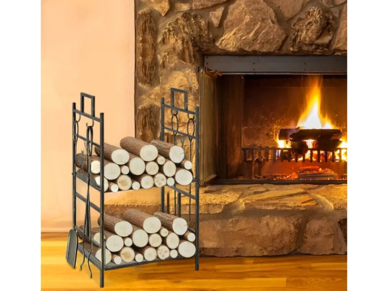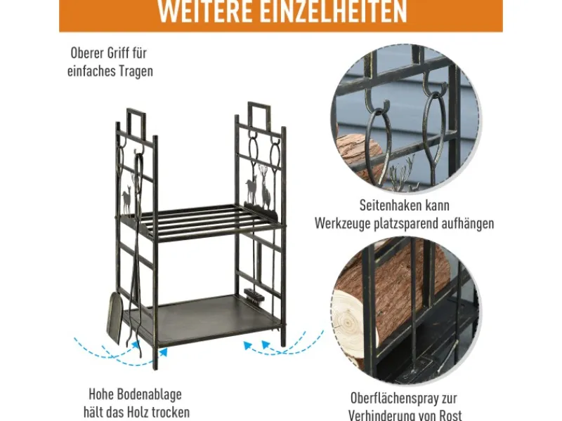 Outsunny Kaminholzregale|Besen|Kaminholzständer mit Kaminbesteck 51,5x33x77 cm