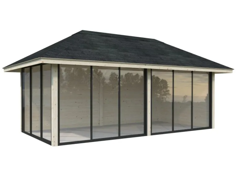 Ein Fußboden, Dacheindeckung und Regenrinne sind optional lieferbar. Der Pavillon wird aus naturbelassenem FSC®-zertifiziertem nordischen Fichtenholz gefertigt. Das Holz muss nach dem Aufbau mit einem Grundieranstrich sowie einer Endbehandlung zum Schutz vor Witterungseinflüsse versehen werden.