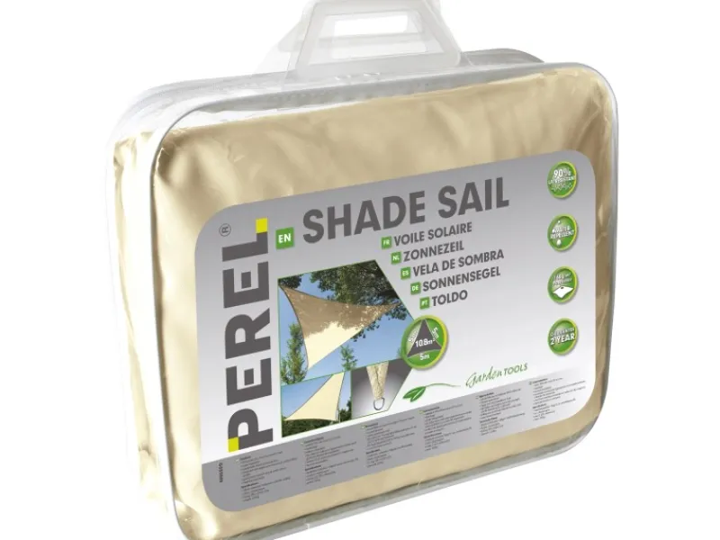 Das cremefarbige Perel Dreieck-Sonnensegel eignet sich hervorragend als Sonnenschutz für Terrassen oder Gärten. Es bietet einen UV-Schutz von 90 % und ist wasserabweisend. Die Seiten sind bogenförmig, damit das Segel gespannt bleibt. Des Weiteren ist es mit D-Ringen (Metall, verzinkt) an allen Ecken ausgestattet und waschmaschinenfest.