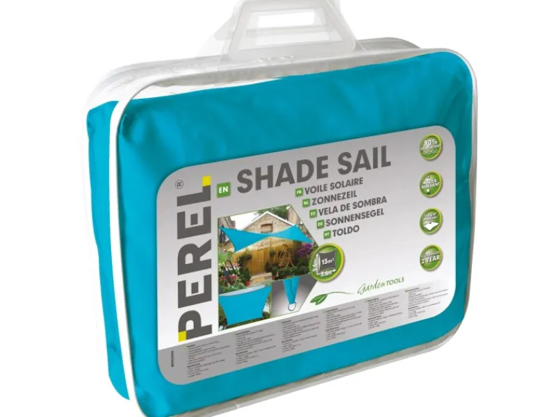 Das blaue Perel Viereck-Sonnensegel eignet sich hervorragend als Sonnenschutz für Terrassen oder Gärten. Es bietet einen UV-Schutz von 90 % und ist wasserabweisend. Die Seiten sind bogenförmig, damit das Segel gespannt bleibt. Des Weiteren ist das Sonnensegel mit D-Ringen (Metall, verzinkt) an allen Ecken ausgestattet und waschmaschinenfest.
