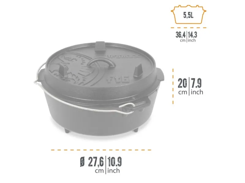 Du kannst den Bräter auf offenem Feuer, auf der Glut, dem Grill, im Atago, im Backofen oder auf einem normalen Herd nutzen. Im offenen Feuer ist der Topf am besten von Kohle umhüllt. Mithilfe der kleinen Standfüße kannst du den Schmortopf direkt ins Feuer oder in die Glut stellen. Der Dutch Oven kann aber auch direkt in das Feuer oder die Glut gestellt oder an ein Dreibein über die Feuerstelle gehängt werden. Der Deckel lässt sich als Pfanne nutzen und verfügt über einen hohen Rand, damit Kohle oder Briketts nicht herunterfallen. Ein robuster Henkel ermöglicht das sichere Heben des Feuertopfes und über die Thermometerdurchführung prüfst du die Temperatur ohne den Deckel anheben zu müssen.