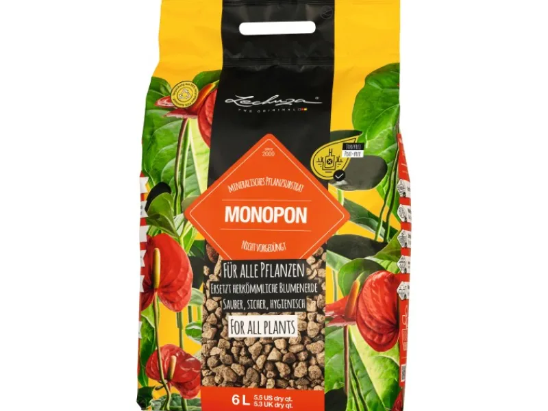 Mit Mono Pon kann Staunässe und Wurzelfäule optimal vorgebeugt werden. Das rein mineralische Substrat ist für alle Pflanzen geeignet und ersetzt Pflanzenerde gänzlich. Dank der besonders hohen Drainagefähigkeit ist es die ideale Drainageschicht für Pflanzgefäße ohne -Bewässerungssystem, da es Wasser optimal abfließen lässt. Auch kann es Pflanzenerde zur Auflockerung beigemischt werden oder als nachhaltige Alternative für Blähton dienen.