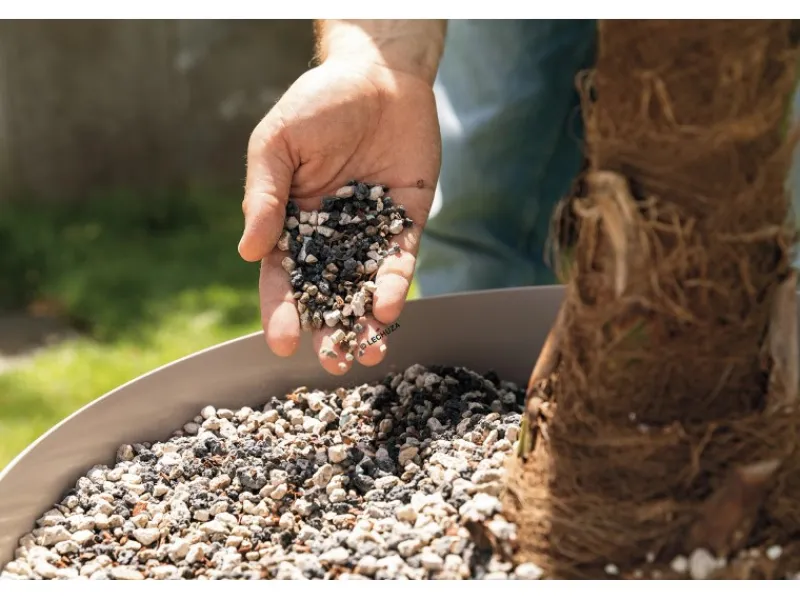 Gestein (Bims, schwarze Lava), Zeolith, Pinienrinde, Langzeitdünger (speziell für Palmen)Für den Einsatz essbarer Pflanzen geeignet.